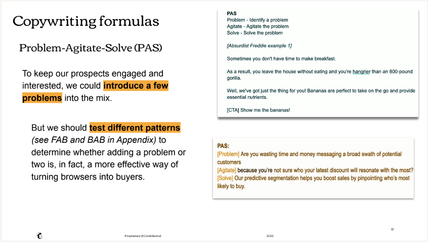 Prior to the redesign, I worked to align key stakeholders by identifying opportunities for improvement, and then outlining the goals, strategy, and ways to benchmark and measure success.Another slide of the redesign pitch deck related to KPIs to measure.Prior to the redesign, we sought alignment by establishing opportunities for improvement, and then outlining the goals, strategy, and ways to measure success.A slide identifying a copywriting formula to test.An early iteration of a messaging fraemwork.