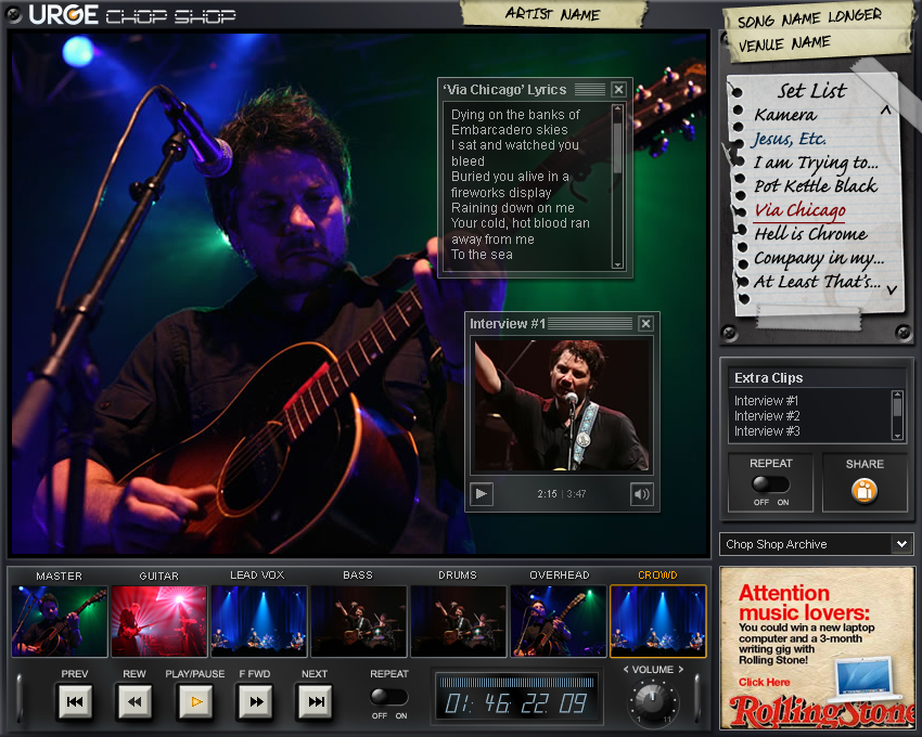 Along with VH1 producer (and music industry legend) Bill Flanagan, I co-created what became Rough Mix: a forward-thinking, interactive experience that gave users control of up to 7 cameras at a live concert. Episodes featured Wilco and Cat Power. Rolling Stone magazine was an enthusiastic supporter and sponsor. The beautifuly-designed and fun-to-use application gained support from Viacom execs and music industry veterans alike.